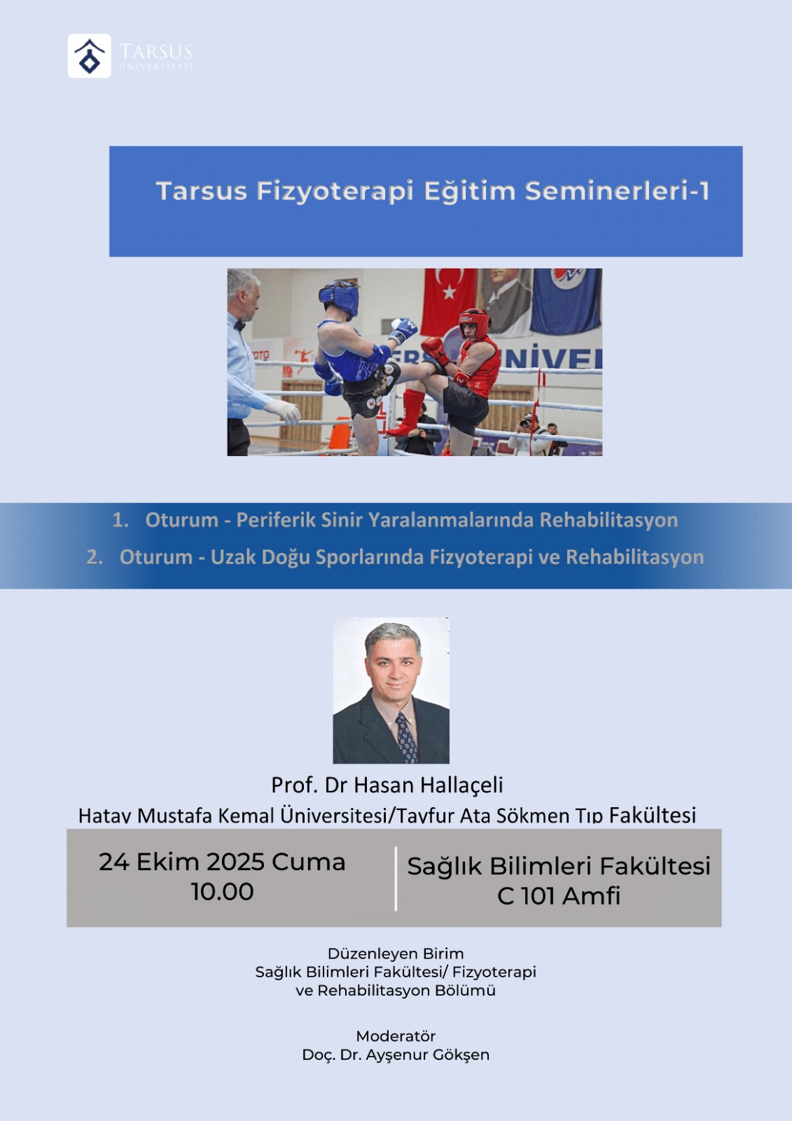 Tarsus Üniversitesi Sağlık Bilimleri Fakültesi Fizyoterapi ve Rehabilitasyon Bölümü tarafından düzenlenen “Tarsus Fizyoterapi Eğitim Seminerleri – 1” etkinliği kapsamında, Hatay Mustafa Kemal Üniversitesi Tayfur Ata Sökmen Tıp Fakültesi öğretim üyesi Prof. Dr. Hasan Hallaçeli konuk olacaktır.