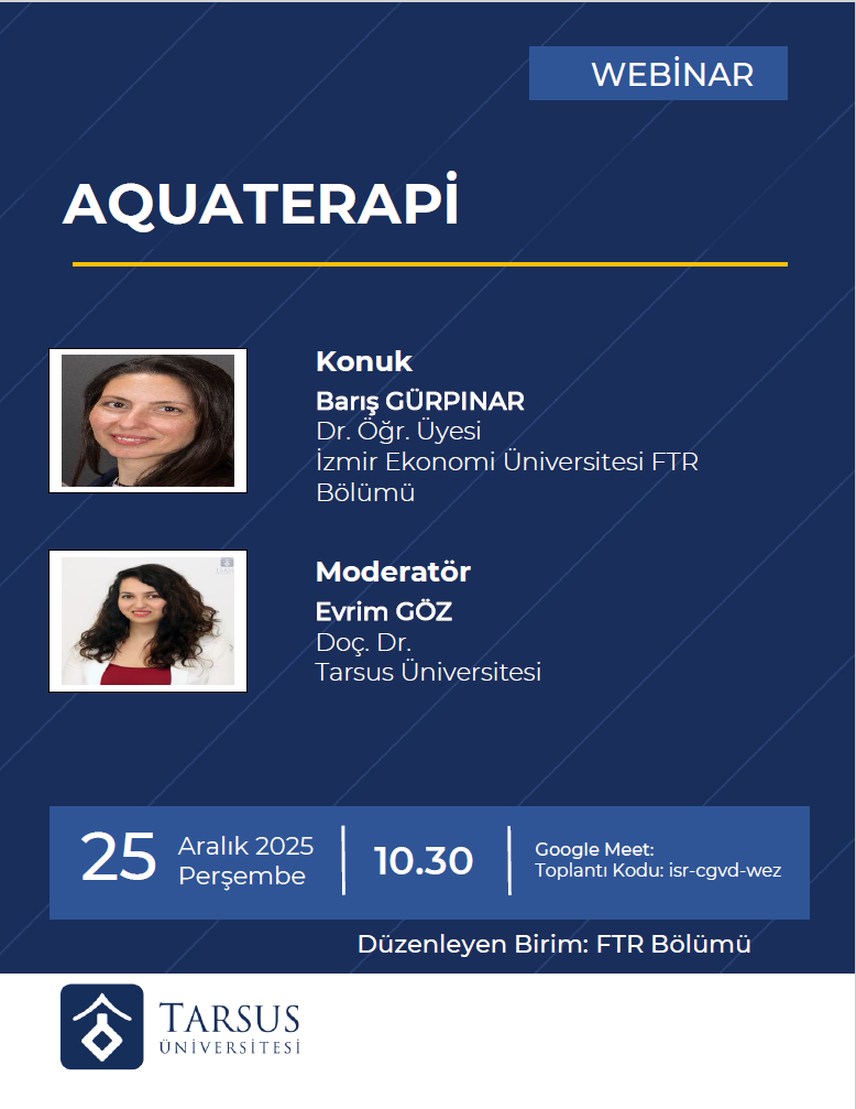 Bölümümüz tarafından, İzmir Ekonomi Üniversitesi Fizyoterapi ve Rehabilitasyon Bölümü’nden Dr. Öğr. Üyesi Barış Gürpınar’ın konuşmacı olarak katılımıyla Aquaterapi konulu bir webinar düzenlenecektir.